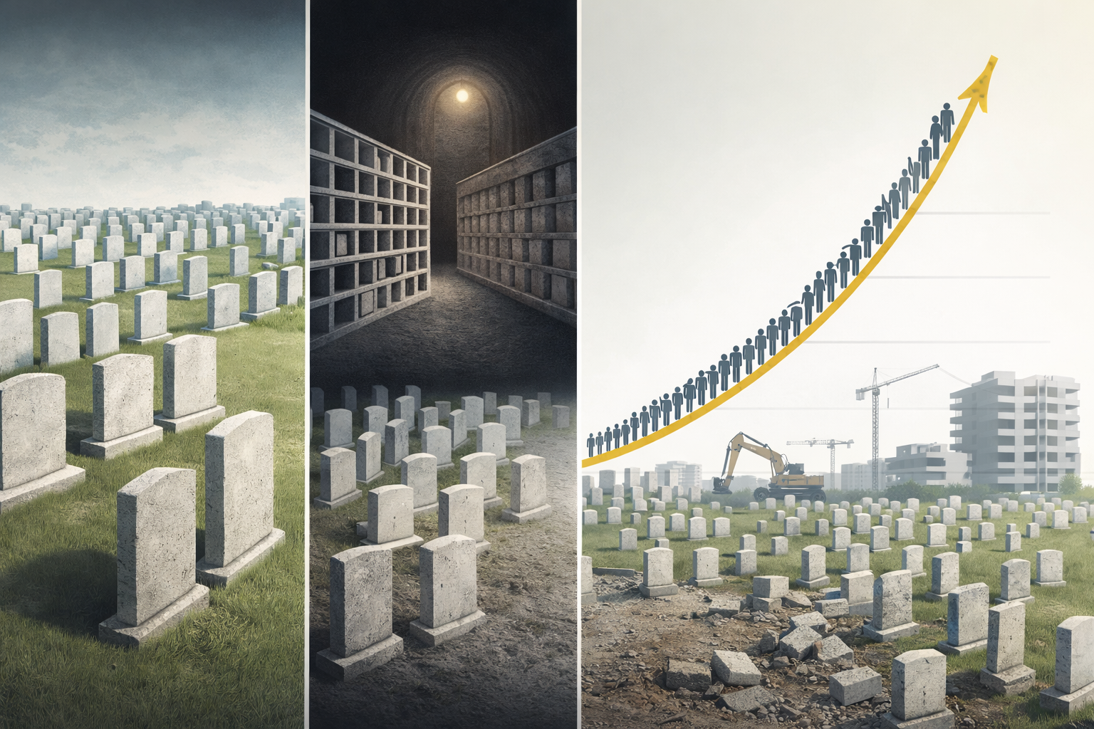 Israel faces a structural burial crisis driven by demographic aging. Traditional field burial allows only 300–370 graves per dunam, while dense methods reach 1,500 and ossuary-based burial up to 3,100 graves per dunam. Maintaining the current model would consume over 3,300 dunams by 2050. Without policy reform, burial land use will directly compete with housing and infrastructure in high-demand areas.