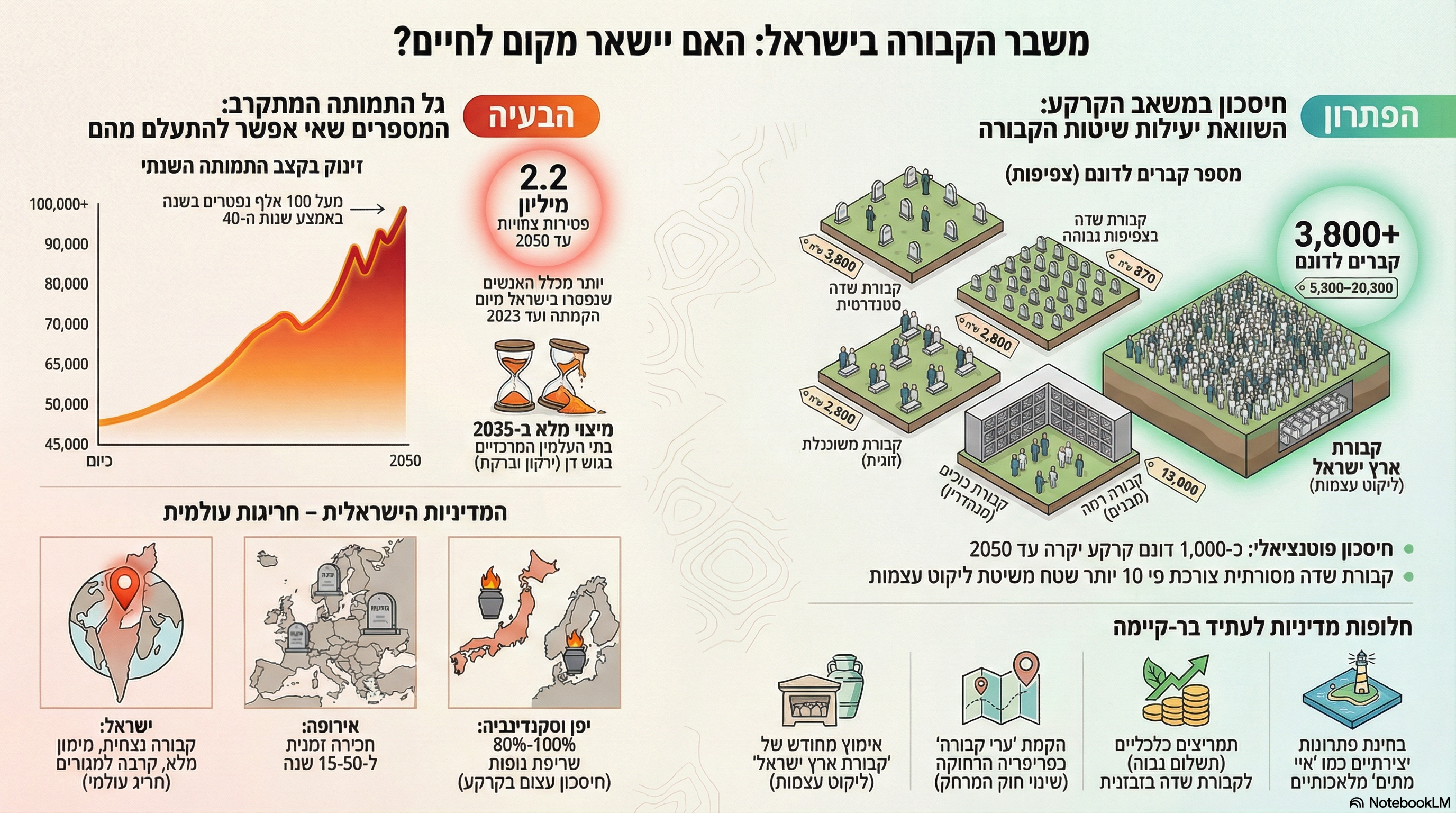 בין 2024 ל-2050 בלבד ימותו בישראל יותר אנשים מאשר מתו מקום המדינה ועד 2023.בתרחיש שמרני של שמירה על תמהיל הקבורה הנוכחי: