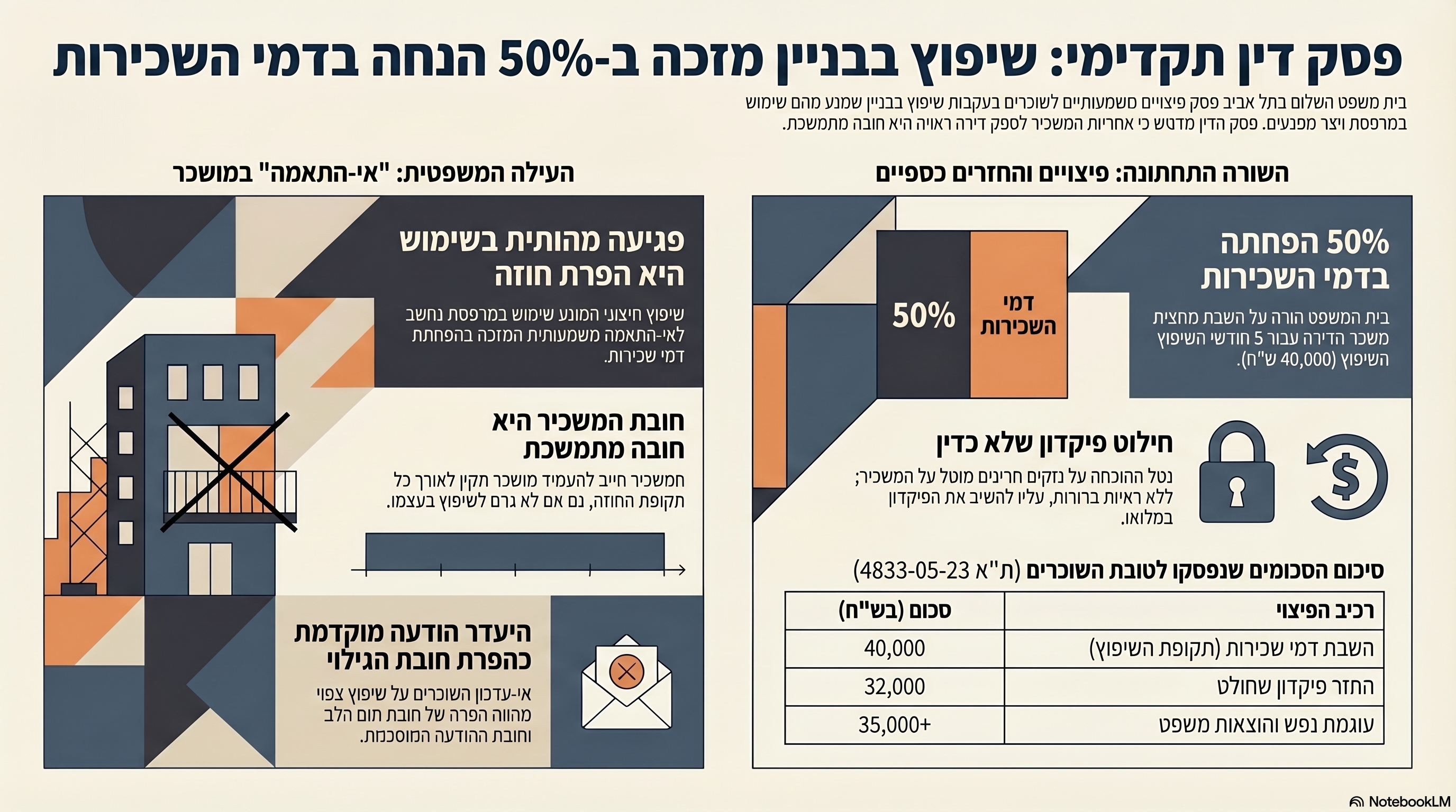 כאשר החוק יוצר תקופת זמן קצרה, מסלול “הסכם יציאה מוגדל”, ואחר כך מנגנון של יזם שיקום שיכול גם לתבוע דיירים שלא התקשרו עמו הדיירים לא עומדים רק מול עסקה, אלא מול מערכת תמריצים ולחצים.וזה כבר לא תיאור תיאורטי: החוק עצמו קובע שיזם שיקום רשאי להגיש לבית המשפט תובענה נגד בעל דירה או בעל מגרש שלא הסכים להתקשר עמו, ואם בית המשפט מוצא שהצורך בשיקום מהיר, יעיל ומיטבי מצדיק זאת, הוא רשאי להורות לנתבע להתקשר בעסקת שיקום או הסכם יציאה, להורות על ביטול עסקה עם יזם אחר, ואפילו למנות עורך דין או רואה חשבון שיפעל בשם הנתבע לצורך ההתקשרות.
