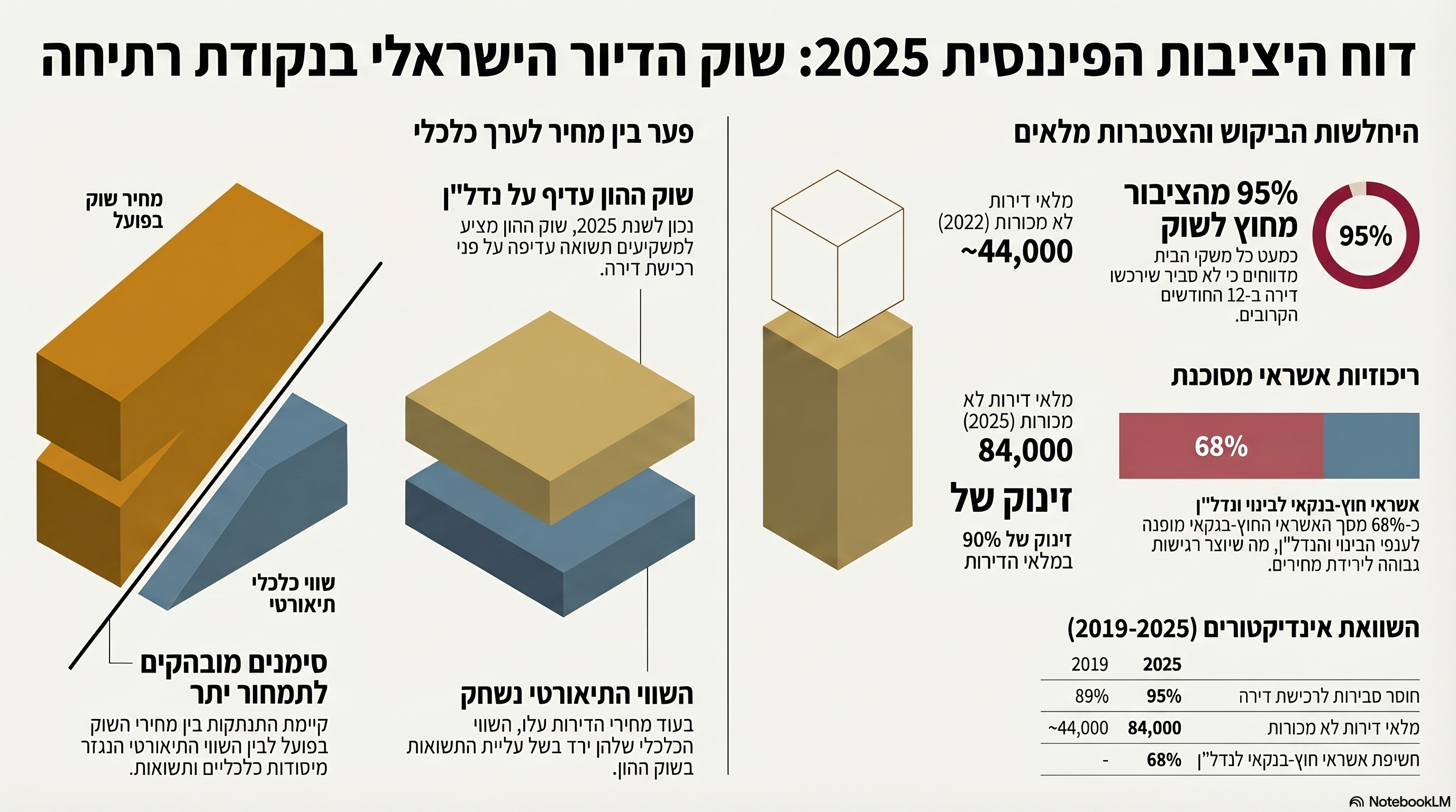 דוח היציבות הפיננסית 2025 של בנק ישראל חושף תמונה מטרידה של שוק הדיור בישראל: תמחור יתר, פער בין מחיר לשווי תיאורטי, מלאי דירות לא מכורות שזינק, ביקוש חלש, משקיעים שמוכרים נטו, ואשראי מסוכן שמתרכז בענפי הבינוי והנדל"ן.