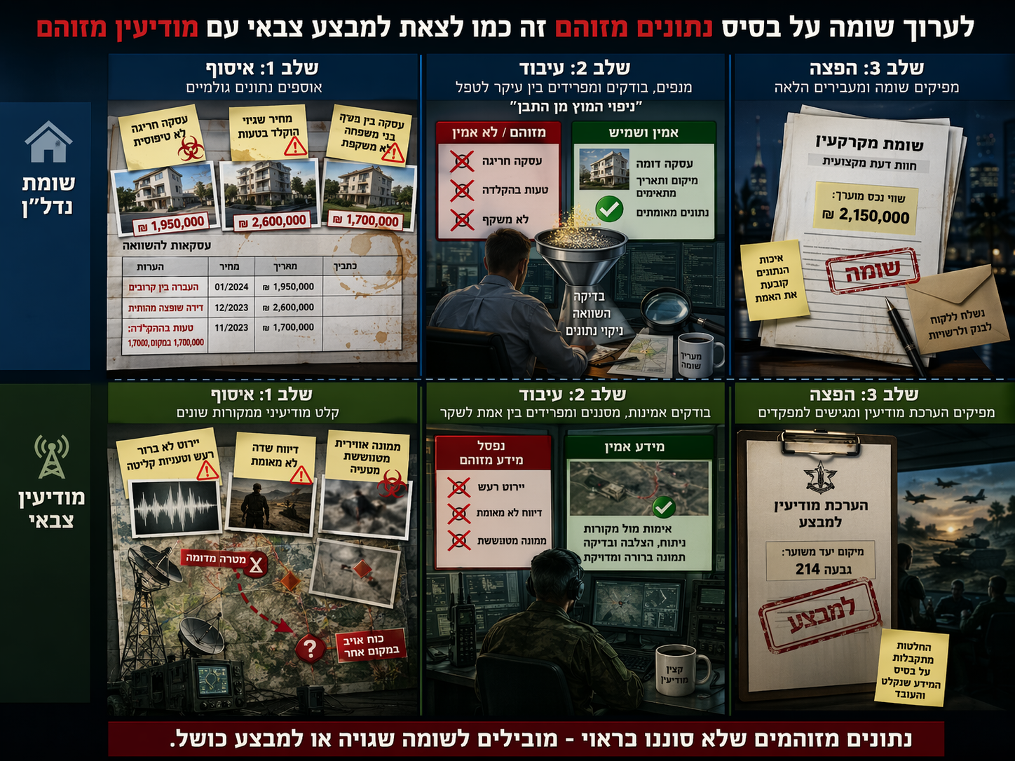 שומה המבוססת על בסיס נתונים מזוהם דומה מאוד למבצע צבאי המתבסס על מודיעין מזוהם. בשני המקרים, הסכנה אינה רק בטעות נקודתית. הסכנה היא בכך שמערכת שלמה נעה קדימה מתוך תחושת מקצועיות, דיוק וביטחון — בעוד חומר הגלם שעליו היא נשענת פגום מלכתחילה. במודיעין, איש מקצוע רציני יודע שלא די באיסוף מידע. מידע גולמי אינו אמת. הוא רק חומר גלם. צריך לאמת אותו, להצליב אותו, לנפות ממנו רעשים, לזהות הטיות, להבין אינטרסים, ולבחון אם הוא בכלל משקף את המציאות או רק מייצר אשליה משכנעת.בדיוק אותו הדבר נכון גם בשמאות. כאשר שמאי נשען על עסקאות השוואה, על מחירים מדווחים, על נתוני שוק, על עסקאות קבלן, על מכרזי קרקע או על בסיסי נתונים מסחריים וציבוריים — הוא אינו מקבל “אמת”. הוא מקבל חומר גלם. אם החומר הזה מזוהם, ואם הוא אינו עובר תהליך עיבוד, ניקוי ובחינה כלכלית אמיתית, גם השומה שתצא בסוף עלולה להיות מסמך מקצועי לכאורה — שמוביל למסקנה שגויה מן היסוד.