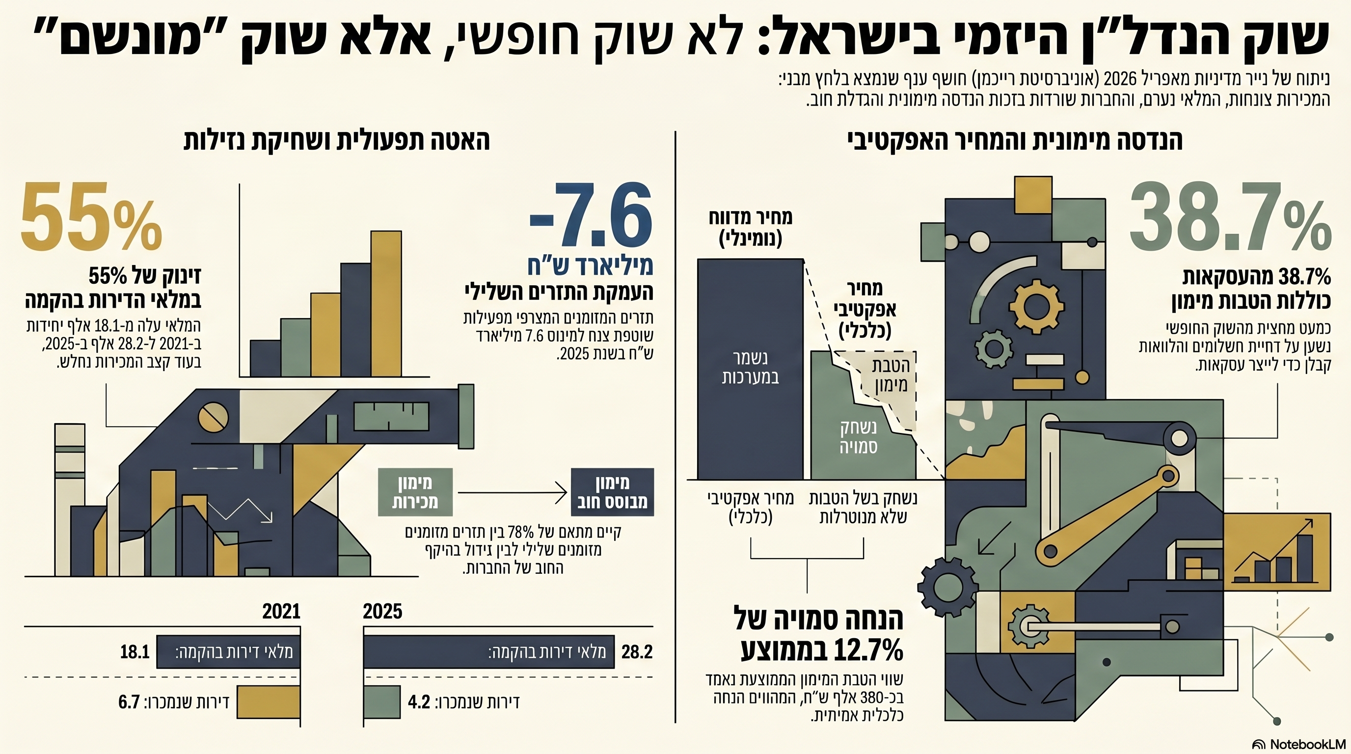- סבסוד ריבית והלוואות קבלן: הטבות מימון ששוות מאות אלפי שקלים מגולמות בתוך מחיר הדירה, מה שיוצר "ניפוח" מלאכותי של המחיר הנומינלי.