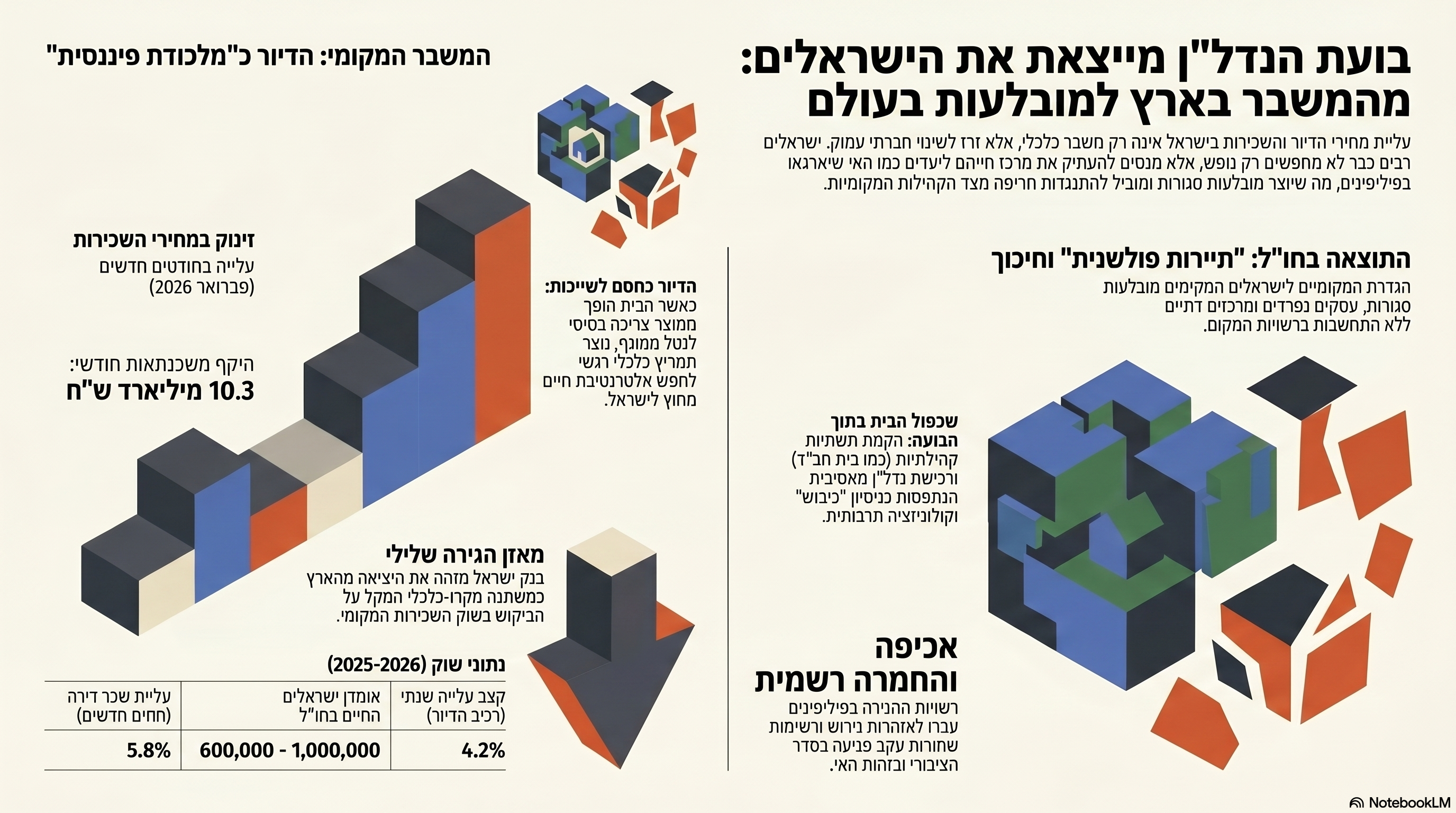 הנתונים הכלכליים מצביעים על כך שהחיפוש אחר חוף פיליפיני אינו גחמה של "דור ה-Z", אלא קטליזטור לעקירה כלכלית. דוח בנק ישראל מפברואר 2026 חושף שוק דיור שהפך לבלתי חדיר עבור חלקים נרחבים מהציבור: