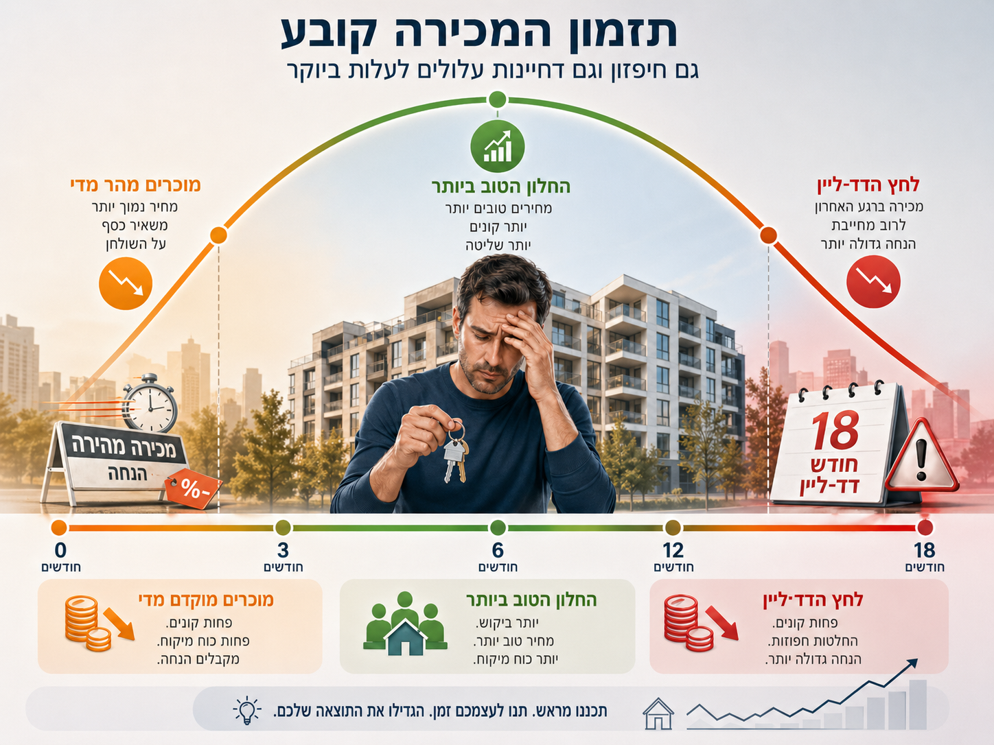 חלון 3 עד 12 חודשים הוא כנראה הזמן שבו המוכר עדיין לא לחוץ מדי, אבל גם לא ממהר מדי.יש לו זמן להציג את הדירה, לבדוק את השוק, לנהל משא ומתן, לסנן קונים חלשים, לא לרוץ אחרי ההצעה הראשונה, ולמצות טוב יותר את פוטנציאל המכירה. מצד שני, הוא עדיין רחוק מספיק מהדד־ליין, ולכן אינו משדר מצוקה.זו נקודה שמאית ושיווקית חשובה מאוד:
