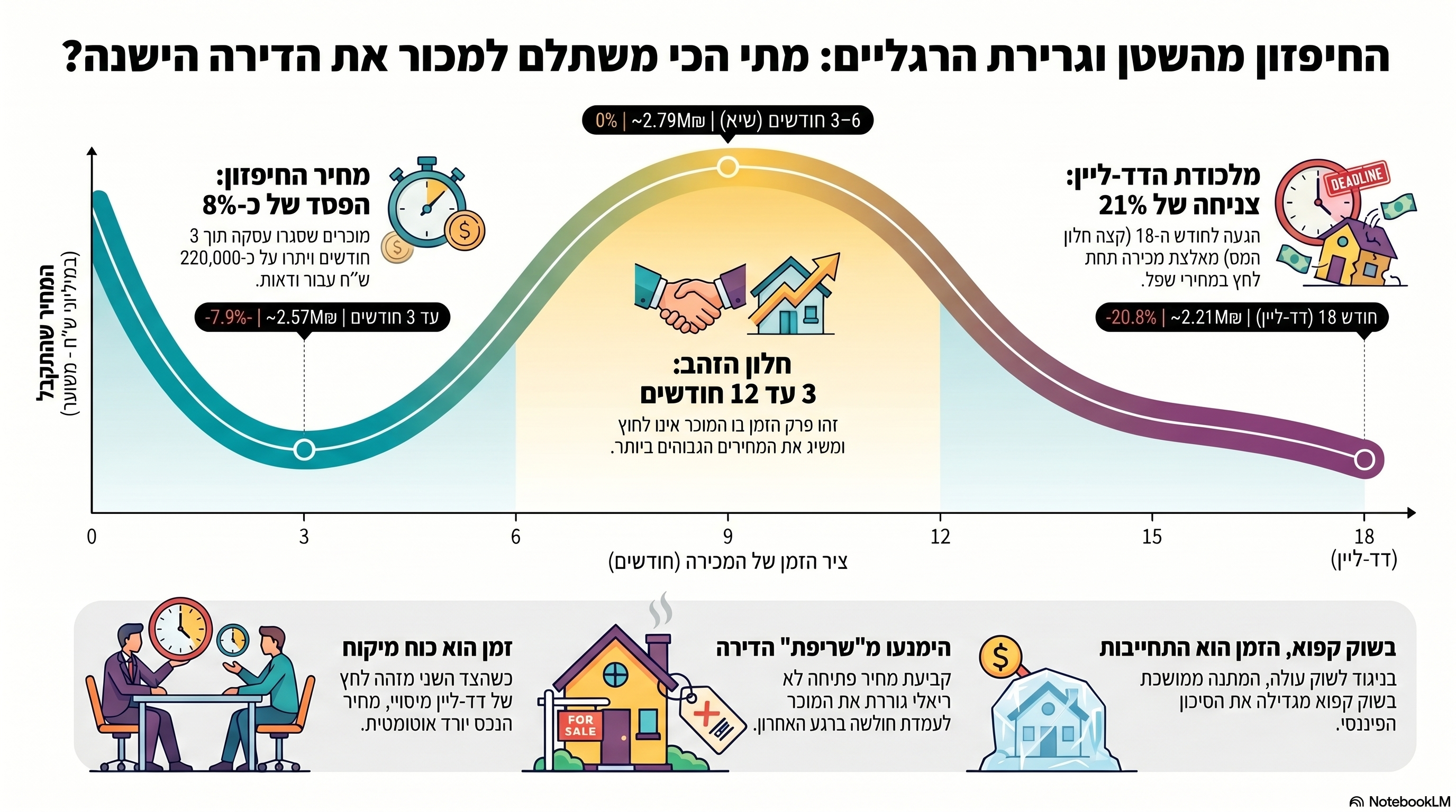 ומי שמנהל את המכירה בחלון סביר, עם זמן, שליטה ותמחור נכון, נמצא בעמדה טובה יותר.זה אינו גרף שמוכיח שכל המתנה היא טעות. זה גרף שמזהיר מפני שני קצוות: מכירה חפוזה מתוך פחד, ומכירה מאוחרת מתוך שאננות.בשוק עולה, הדחיין נראה לפעמים גאון.