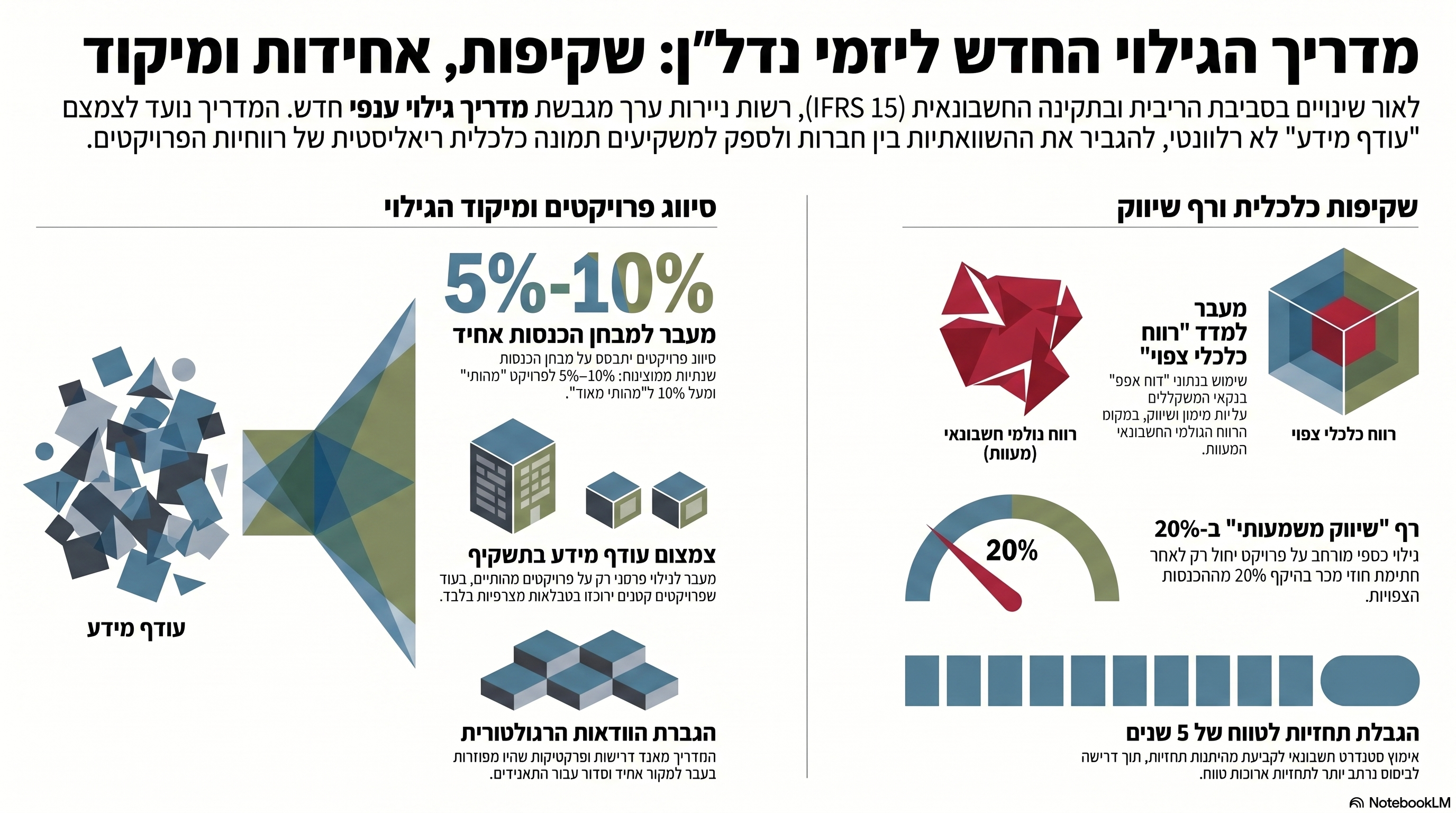 אחד השינויים המהותיים ביותר במדריך הוא ההכרה הרשמית בכך שנתון ה"רווח הגולמי" הפך ללא רלוונטי לניתוח ביצועי פרויקט נדל"ני. המעבר לתקן IFRS 15 יצר נתק מובנה: ההכנסות מוכרות רק במועד מסירת הדירה (העברת השליטה), לעיתים שנים לאחר שהפעילות הכלכלית והשיווקית בוצעה. לכך הצטרפה סביבת הריבית הגבוהה, שהפכה את עלויות המימון למרכיב קריטי שאינו מקבל ביטוי ברווח הגולמי המסורתי.הפתרון של הרשות הוא "ניצחון הריאליזם הכלכלי": מעבר לשימוש בנתונים מתוך "דוח אפס" – המודל המשמש את הבנקים לליווי פיננסי. כפי שמציין סגל הרשות בטיוטה:"הרווח הגולמי בענף הנדל״ן היזמי התרחק מהתוצאה הכלכלית של הפרויקט... הרווח הגולמי אינו משקף עוד את מלוא עלויות המימון הכרוכות בהקמת הפרויקט."השימוש בנתוני דוח אפס מאפשר למשקיעים לראות את ה-"Economic Profit" – נתון המשקלל עלויות מימון, שיווק והנהלה, ומייצר הלימה מלאה בין הדיווח לבורסה לבין המודל העסקי שעל בסיסו פועלת החברה מול המערכת הבנקאית.