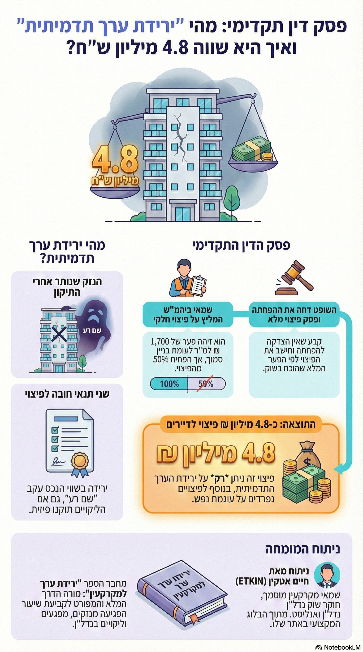 | נגיעות חמורה (נזק מבני, עמודים, שלד עץ) | 25%–40% ואף יותר | סיכון ביטוחי, צורך בחיזוקים הנדסיים, ירידת ערך ארוכת טווח |