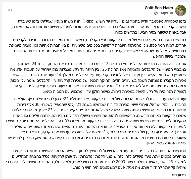 בן נאים מציינת בצדק: מי שמכרו קרקעות בתחילת 2022 היו דווקא הקבלנים הגדולים – אלה שזיהו את השינוי בשוק לפני כולם.