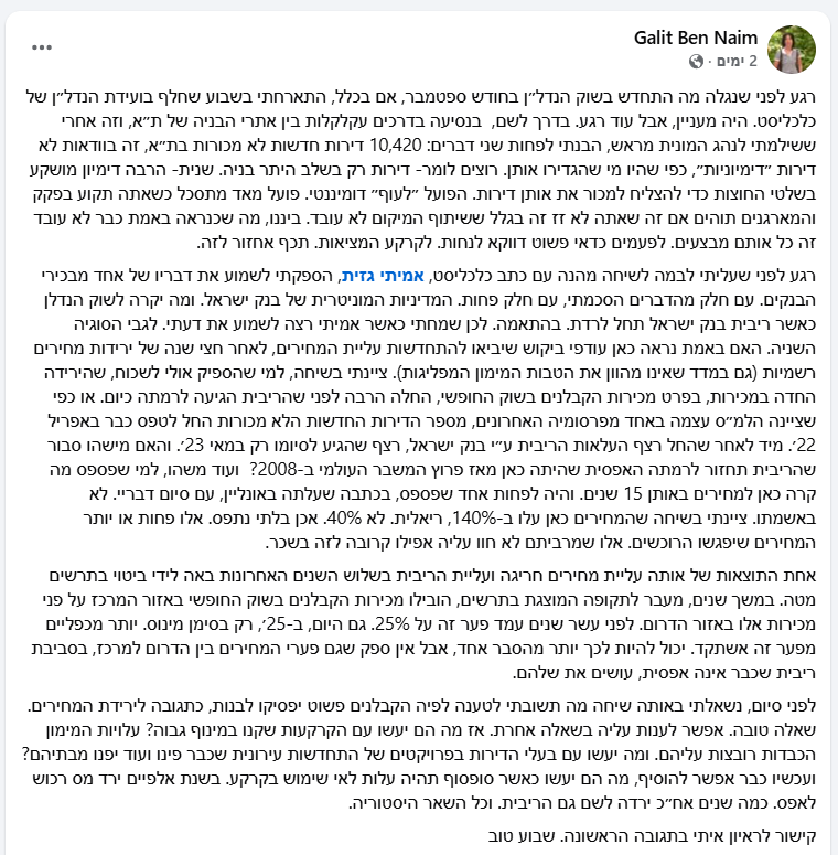 הפוסט של גלית בן נאים הוא מהחדים והעשירים ביותר שנכתבו לאחרונה על שוק הנדל"ן, כי הוא משלב נתונים, תובנות מבפנים והומור ציני שמסתיר ביקורת מערכתית חריפה.