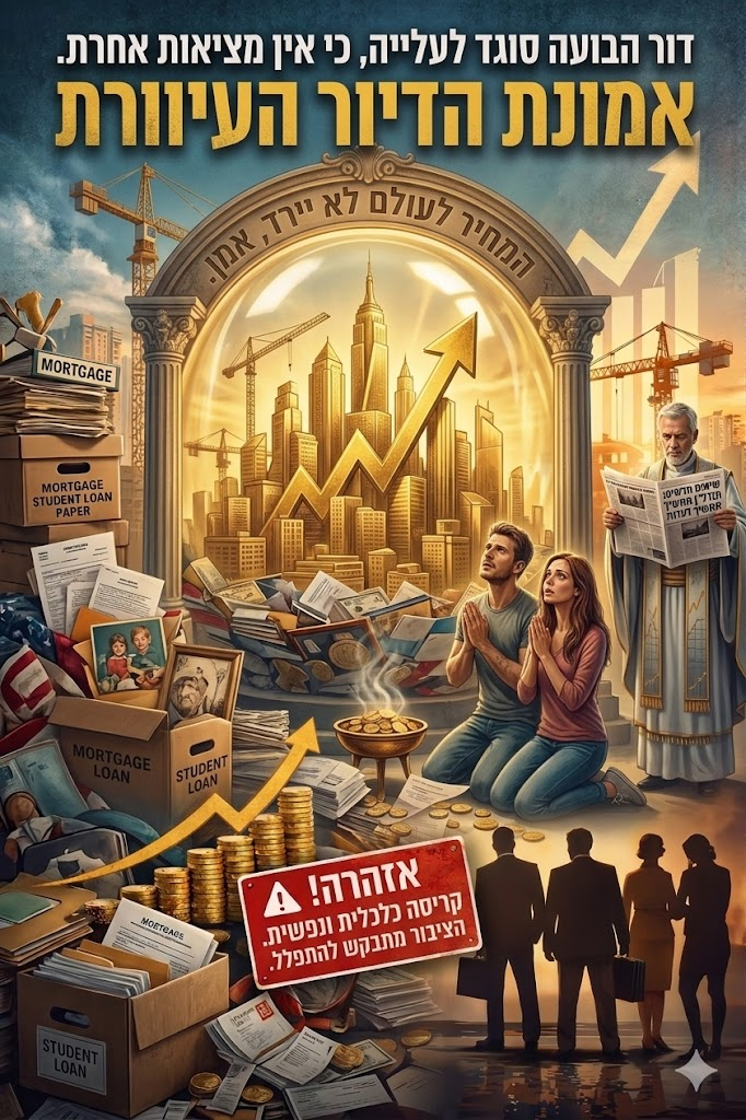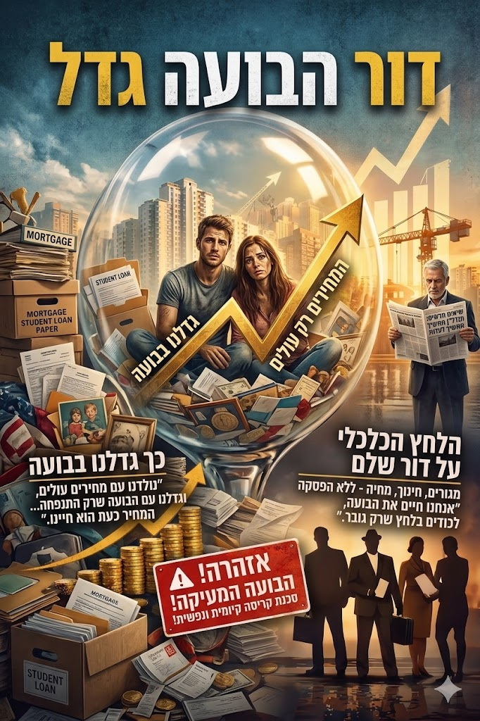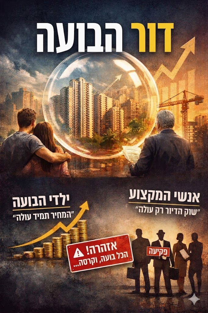 דור הבועה לא נולד לתוך שוק. הוא נולד לתוך קונספציה. ילדי הבועה לא גדלו על כלכלה. הם גדלו על האמונה שנדל"ן תמיד עולה. הנזק החמור ביותר של בועה ממושכת אינו רק המחיר המנופח, אלא בעלי המקצוע שמפסיקים להבין שהוא מנופח. בהתחלה המחיר רדף אחרי השווי. אחר כך הוא חלף על פניו. מאז הוא ממשיך לברוח. מאחורי בועת הנדל"ן לא עמדה רק ריבית נמוכה, אלא גם קונספציה קשיחה.