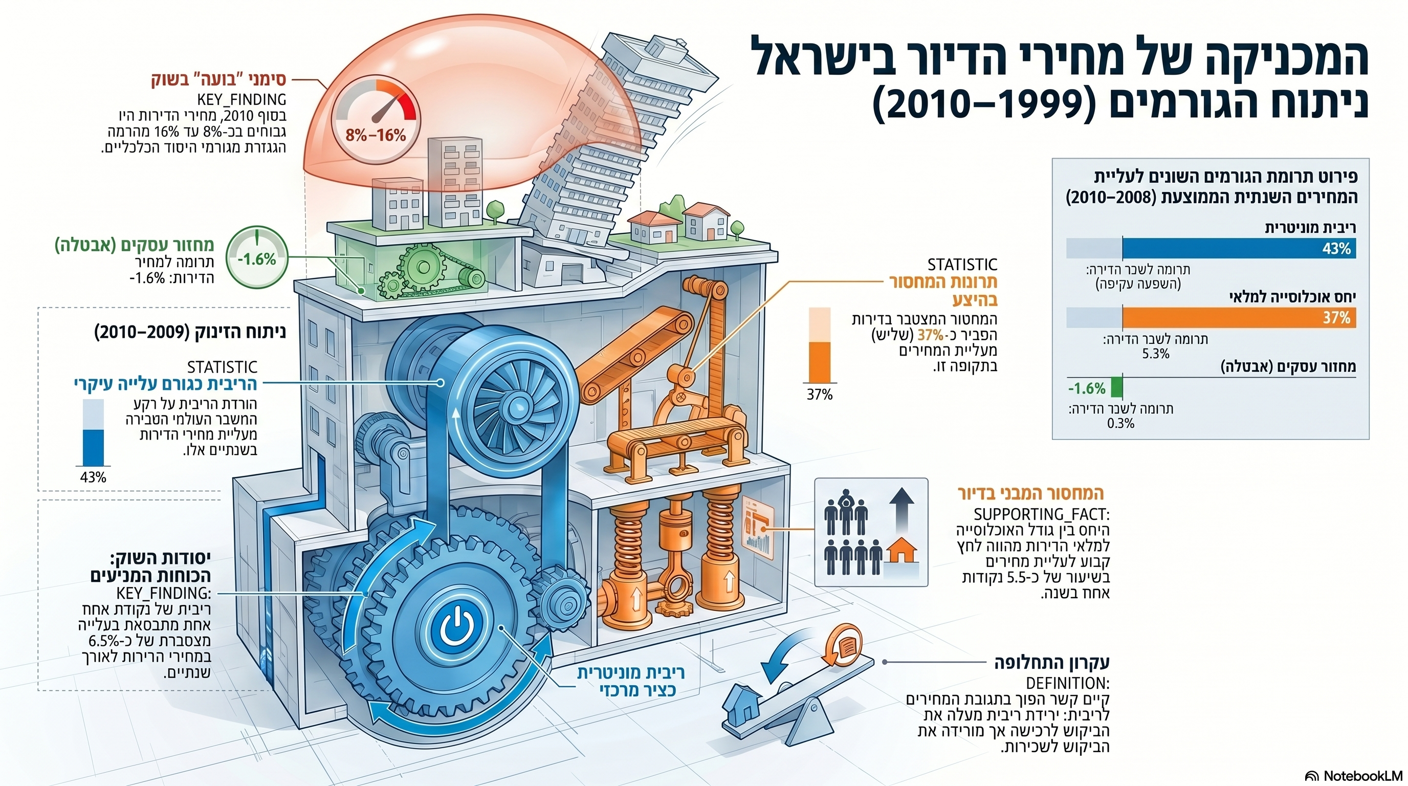 תובנה 1: הריבית היא ה"אשמה" העיקרית – ולא רק המחסור הנרטיב המקובל בישראל גורס כי "אין מספיק דירות, ולכן המחירים עולים". אלא שהמחקר של סגל ונגר מוכיח שהמנוע האמיתי מאחורי הטירוף של 2009–2010 היה הורדת הריבית המוניטרית לרמות שפל בעקבות המשבר העולמי. הורדת הריבית לבדה הסבירה כ-43% מעליית המחירים בשנתיים הללו.החוקרים מזהים שני ערוצים מרכזיים: זילות המשכנתאות מחד, ו"ערוץ תיק הנכסים" מאידך – מצב שבו משקיעים מחפשים תשואה בנדל"ן כחלופה לאפיקי שוק ההון שאיבדו את האטרקטיביות שלהם. לפי נתוני המחקר:"הורדת ריבית של נקודת אחוז אחת העלתה את מחירי הדירות בכ-6.5% בתהליך שנמשך כשנתיים (כשיתר הדברים קבועים)."חשוב להבין את הנואנס המקצועי: לא רק הריבית קצרת הטווח של בנק ישראל השפיעה, אלא גם הריבית הריאלית ארוכת הטווח על משכנתאות. ירידת הריבית הזו יצרה "אינרציה מוניטרית" שהייתה חזקה בהרבה מכל מחסור פיזי בלבנים ובמלט.
