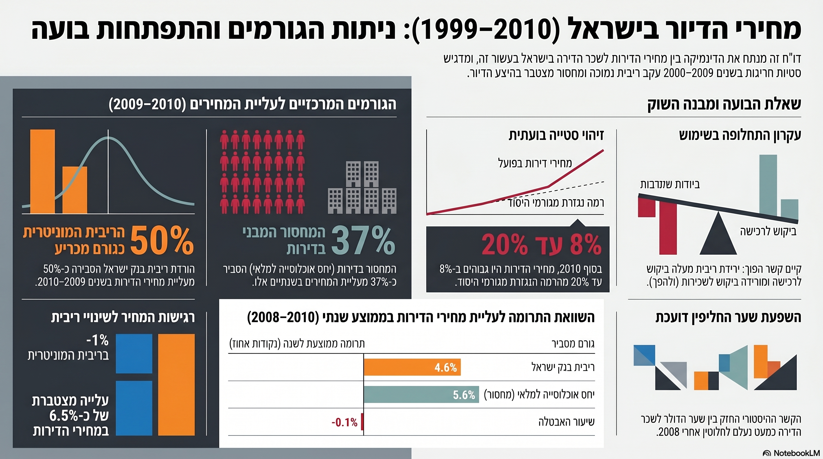 בין השנים 2008 ל-2010, עבר שוק הדיור הישראלי טלטלה ששינתה את פני הכלכלה המקומית: מחירי הדירות זינקו בשיעור ריאלי דרמטי של 41% (בניכוי מדד המחירים לצרכן ללא דיור). הזינוק המטאורי הזה הוליד ויכוח ציבורי סוער – האם מדובר בבועה פיננסית מסוכנת, בתוצאה בלתי נמנעת של מחסור פיזי בלבנים, או שמא בכוחות מאקרו-כלכליים עמוקים יותר?על בסיס ניתוח עומק של חטיבת המחקר בבנק ישראל (מאת גיא סגל וויצמן נגר), אנו מפרקים את הגורמים שהובילו לנסיקה הזו. הממצאים חושפים תמונה מורכבת שבה המדיניות המוניטרית והמבנה הקשיח של שוק ההיצע יצרו "סערה מושלמת".