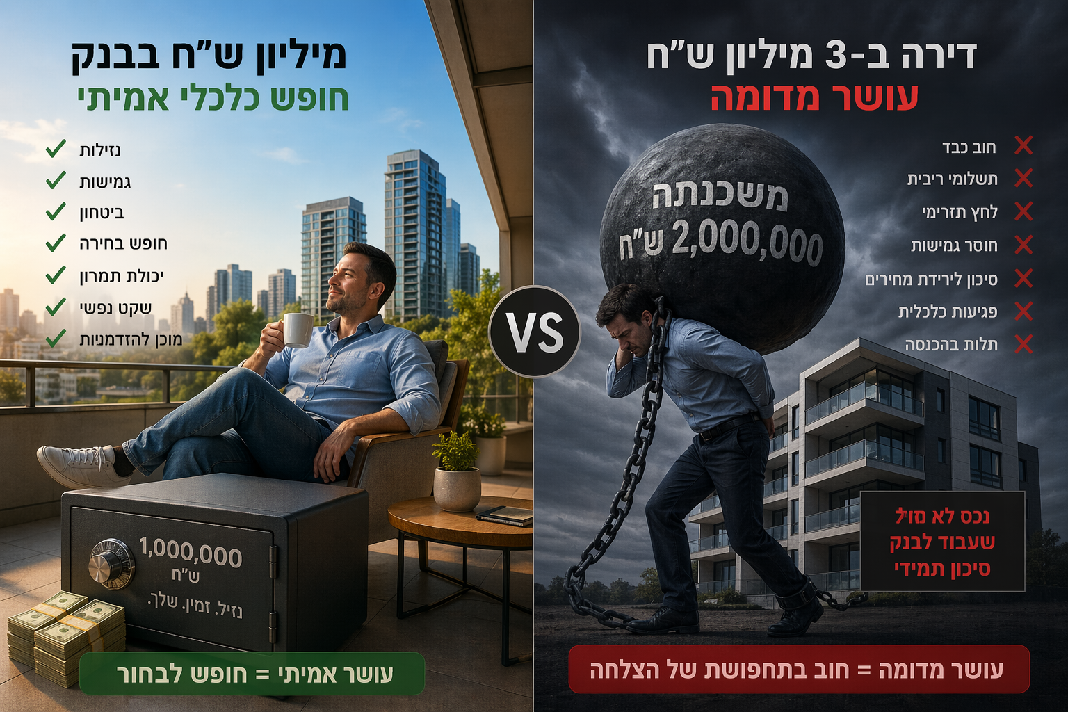 לכן הייתי מנסח את התובנה כך: מי שמחזיק מיליון ש"ח נזילים וללא חוב כבד עשוי להיות עשיר הרבה יותר ממי שגר בדירה יקרה שמומנה במשכנתה חונקת. דירה ממונפת יכולה להיראות כמו עושר, אך לעיתים היא אינה אלא חוב גדול במסווה של הצלחה.