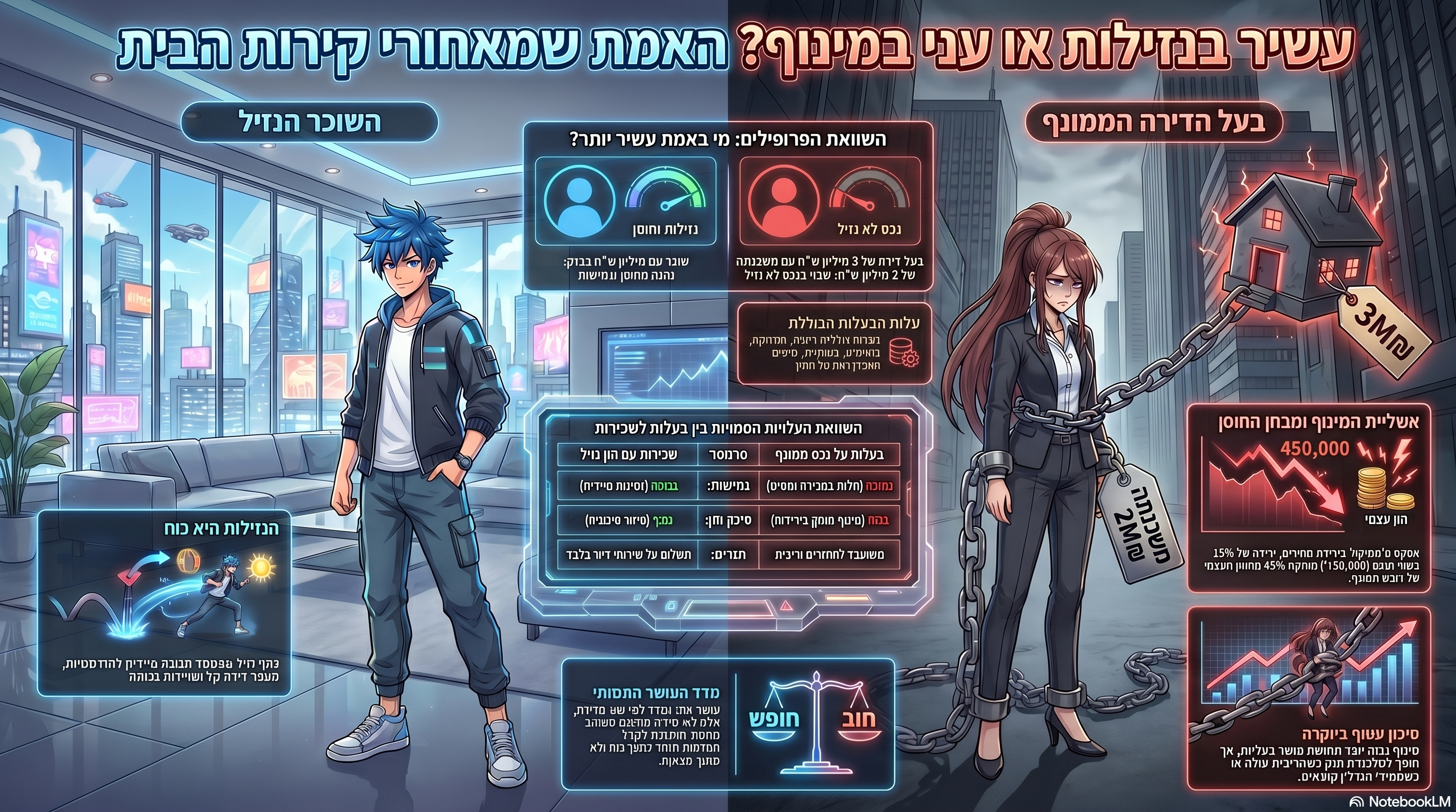 עשיר בנזילות, עני במינוף: ניתוח מקצועי של ההבדל בין עושר אמיתי לבין עושר מדומה בשוק הדיור. למה דירה יקרה עם משכנתה עצומה אינה בהכרח סימן לעושר, כיצד נזילות, תזרים, ריבית ומינוף משנים את התמונה, ומה ניתן ללמוד מכך על שוק הדיור בישראל בשנת 2026.